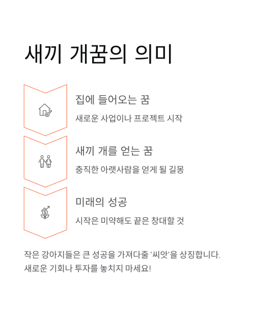 새끼 **강아지가 집에 들어오는 꿈**이나 **새끼 개를 얻는 꿈**은 새로운 사업이나 프로젝트를 시작하게 되거나, 자신을 도와줄 충직한 아랫사람을 얻게 될 길몽입니다. 특히 작은 강아지들은 미래에 큰 성공을 가져다줄 '씨앗'을 상징하므로, 시작은 미약해도 끝은 창대할 것임을 암시합니다. 이 꿈을 꾸셨다면 새로운 기회나 투자를 놓치지 마세요!