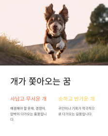 - 개가 쫓아오는 꿈: 쫓아오는 개가 **사납거나 무서웠다면** 현실에서 해결해야 할 문제, 경쟁자, 혹은 압박이 다가오고 있다는 흉몽입니다. 하지만 **순하고 반가웠다면** 귀인이나 기회가 나에게 적극적으로 다가오고 있다는 길몽입니다.