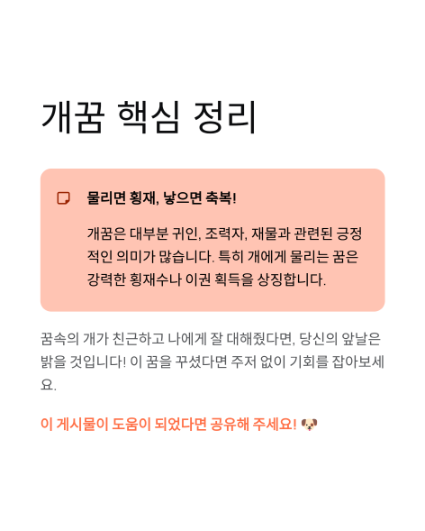 여러분의 특별한 개꿈 이야기나 풀이가 궁금하다면 **댓글**로 공유해 주세요! **공감 버튼**은 더 많은 행운을 부릅니다.