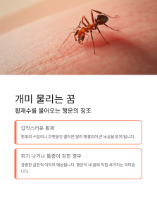 개미에게 물리는 꿈은 통증이 느껴졌다면 찝찝할 수 있지만, 해몽은 오히려 **갑작스러운 횡재수**를 암시하는 경우가 많습니다. 특히 벌레나 곤충에게 물리는 꿈은 **재물복**과 연관이 깊은데요.